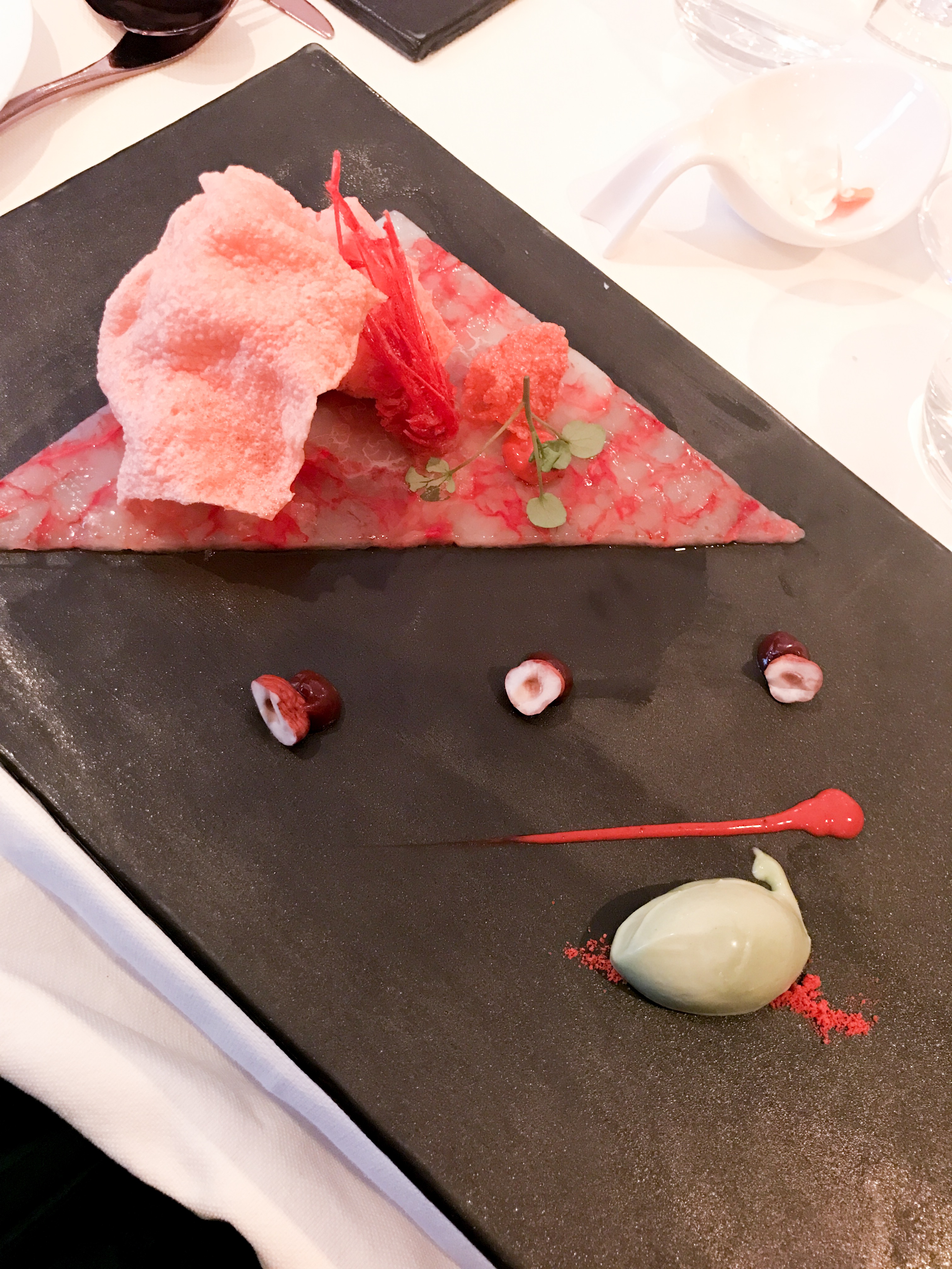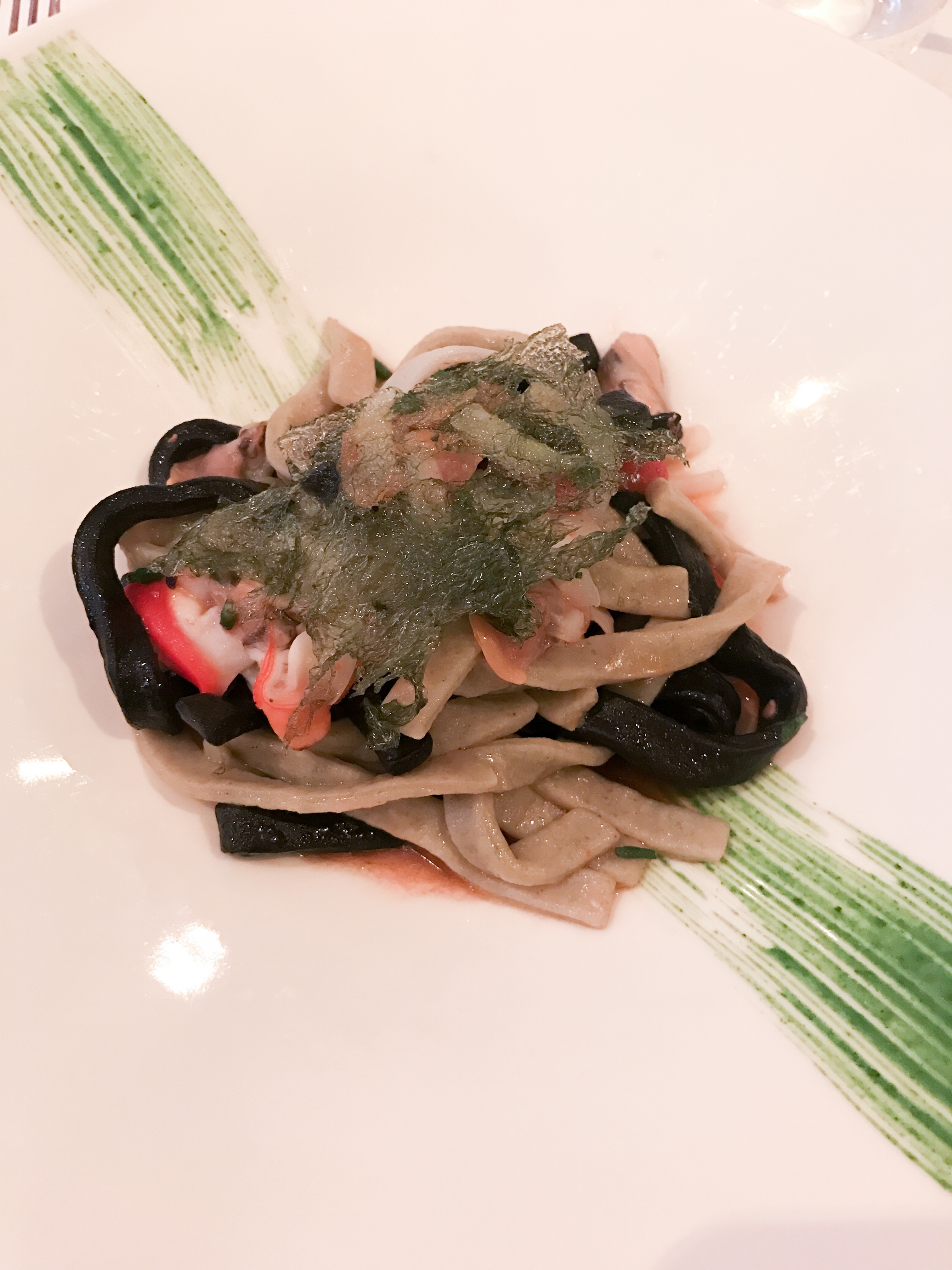 Se proviamo ad ignorare la parte comica dovuta all’enorme disagio che mi accompagna nella vita, è stata una serata magnifica: dopo poco mi sono sciolta e mi sono goduta la cena squisita, tra piatti splendidi e chiacchiere terminate in risate fino alle lacrime. Come antipasto ho scelto carpaccio di gambero rosso di Mazara con mousse alla nocciola di Giffoni e gelato al Plancton (che quando mamma il giorno dopo mi ha cucinato merluzzo surgelato le ho chiesto “cara, dov’è il mio carpaccio di gambero rosso?”), seguito da scialatielli al nero e alghe marine con calamaretti, frutti di mare e pomodorini del Piennolo (la fine del mondo!), seguiti da una squisita tarte tatin (torta di mele caramellate e pasta sfoglia), seguita da una torta a sorpresa ai tre cioccolati e sfere di amarene con la candelina da spegnere per il primo compleanno (quante coccole!), seguita da vassoi di piccola pasticceria – e a questo punto abbiamo iniziato a piangere dalle risate perchè più piene di così non lo eravamo mai state ma continuava ad arrivare cibo e non lo avremmo potuto lasciare mai nei piatti, quindi è iniziata una lotta all’ultimo sangue con i pasticcini.